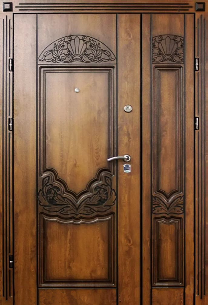 Поскольку в большинстве случаев устанавливаемые на входе в коттедж двустворчатые двери являются еще и предметом интерьера, украшающим здание, их дизайну предается особое значение. Эти двери, как правило, отделываются атмосферостойким МДФ, натуральным шпоном, массивом. Эффектно на таких дверях смотрится витражный узор, применение ковки, зеркальных элементов. Вариантов декора входной двустворчатой двери масса, тут все зависит от пожеланий заказчика.